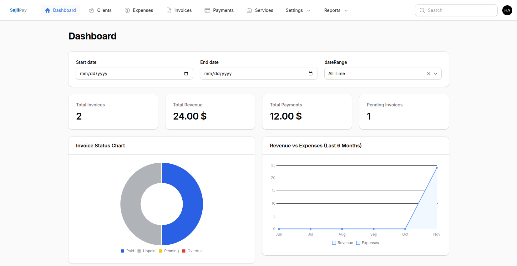 SajilPay helps small businesses manage invoices, payments, clients, and HR — all from one simple, powerful dashboard